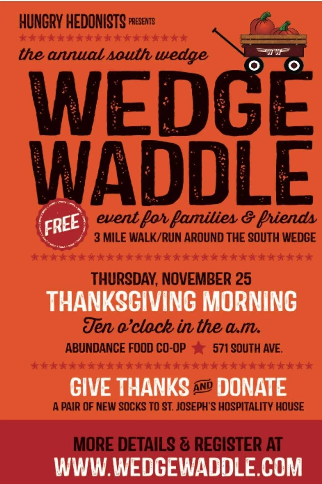 Back to All Events Annual Wedge Waddle Thursday, November 25, 2021 10:00 AM 12:00 PM Abundance Food Market 571 South Ave. Rochester, NY 14620 USA (map) Google Calendar ICS